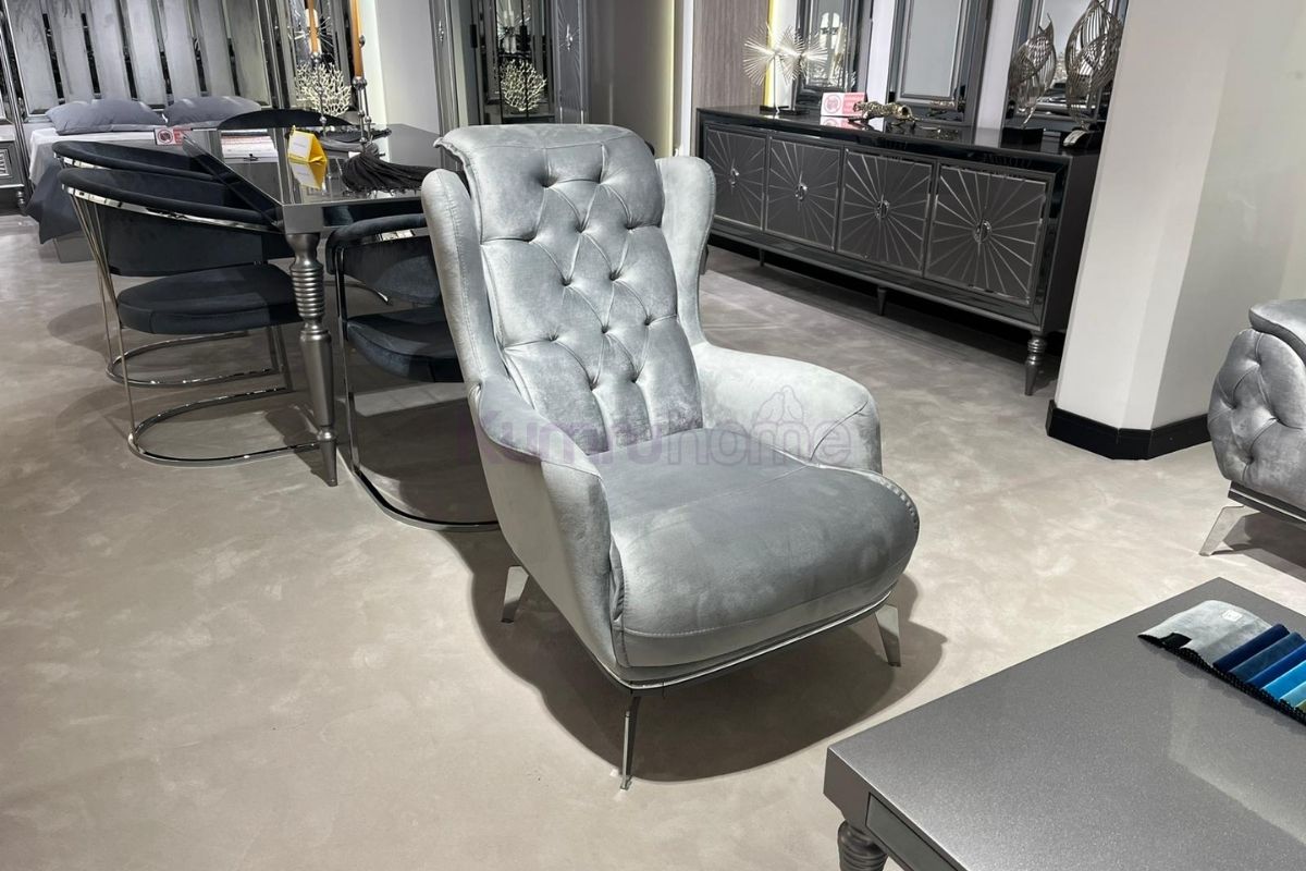Fendi Koltuk Takımı, klasik lüksün modern çizgilerle yeniden yorumlanmasıdır. Takımın sırt ve kol içlerinde kullanılan el işçiliği yoğun kapitone (baklava dilimi) detayları, tasarıma derinlik ve zenginlik katar. Yumuşak dokulu birinci sınıf kadife kumaşı, her dokunuşta kaliteyi hissettirirken gümüş renkli zarif ayak yapısı estetik bir kontrast oluşturur.