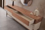 1. Organik Formlu Konsol & Ayna: Konsolun üst tablasında kullanılan ceviz dokusu, krem renkli gövde ve ince ayak yapısıyla mükemmel bir denge sağlar. Takımın imzası niteliğindeki asimetrik formlu ayna, duvarda sanatsal bir derinlik oluşturur.
