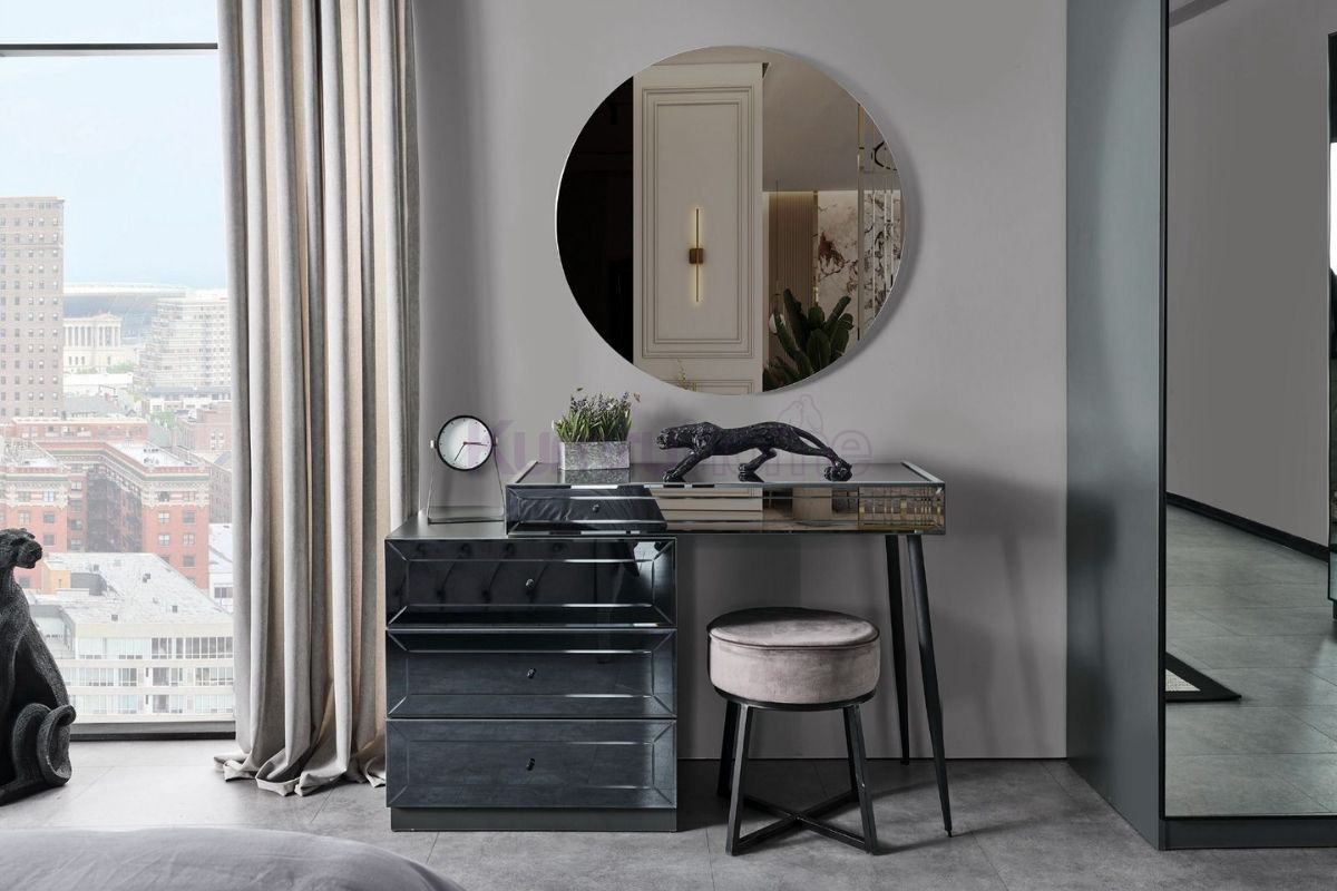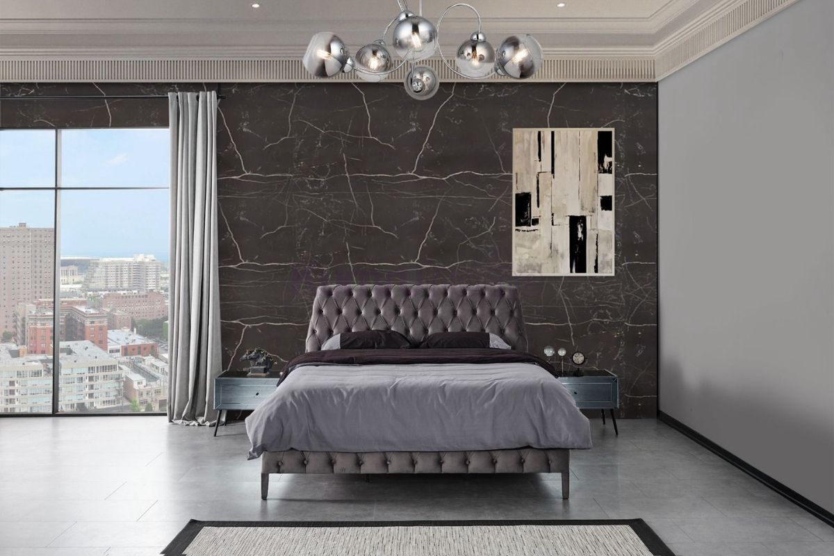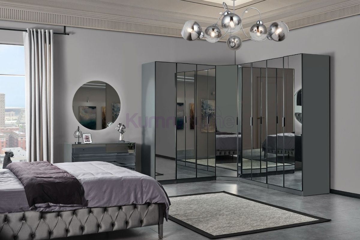 Oslo Yatak Odası, maskülen şıklığı zarafetle harmanlayan özel bir koleksiyondur. Takımın merkezinde yer alan kapitone detaylı kadife yatak başlığı, konforu görsel bir şölenle birleştirirken; antrasit yüzeyler ve füme ayna detayları mekâna modern bir derinlik katar.
