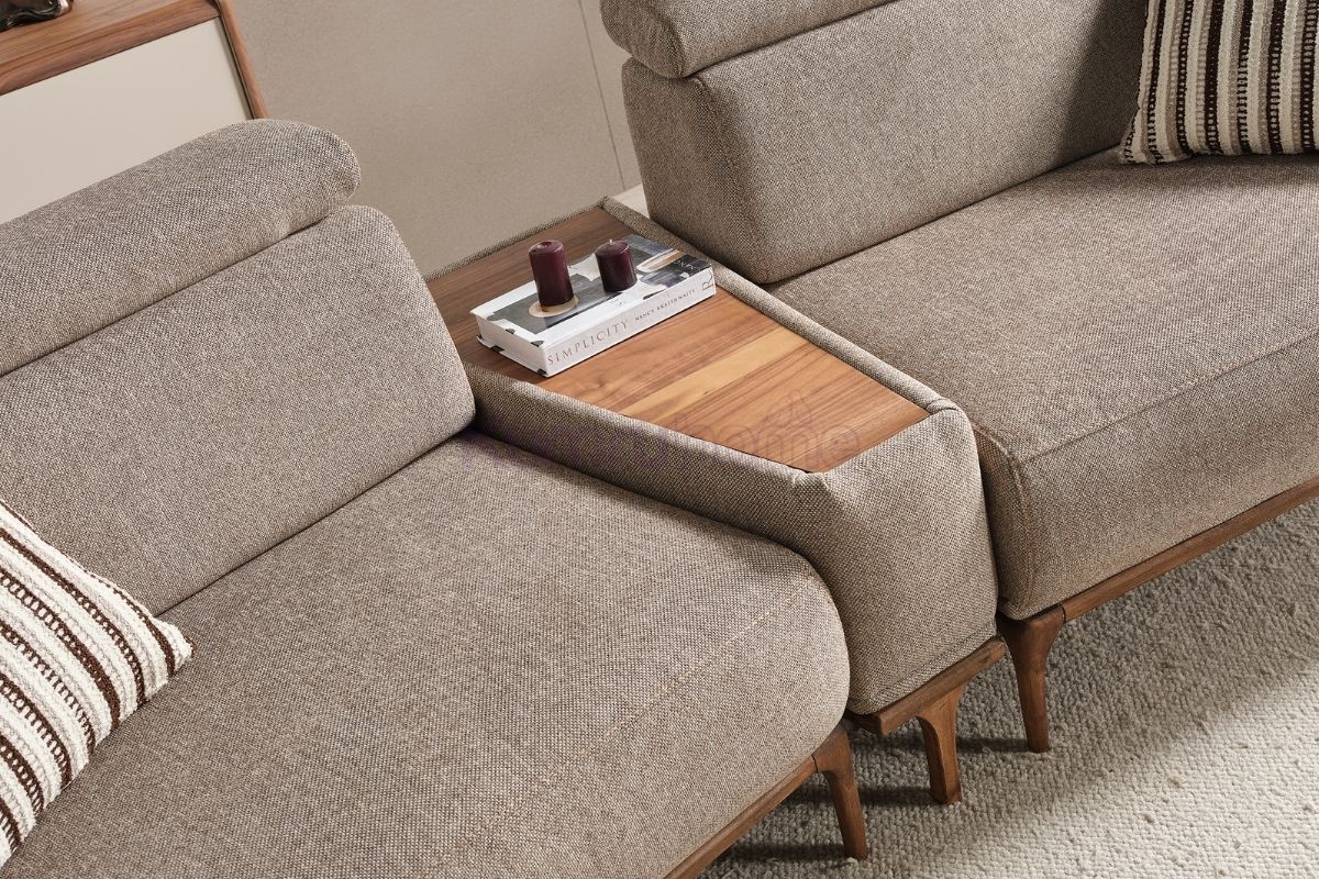 3. Fonksiyonel Ara Modül: Takımın ortasında yer alan sehpa entegreli ara modül, içecekleriniz ve kişisel eşyalarınız için pratik bir alan sunarak konforunuzu kesintisiz kılar. Yerden yüksek ahşap ayak yapısı ise robot süpürge kullanımı için ideal bir alan bırakır.