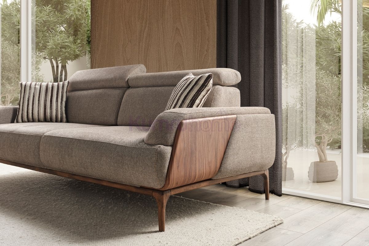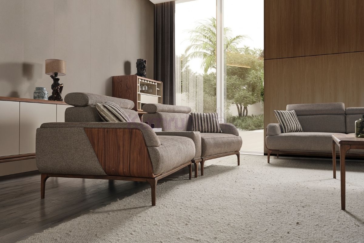 1. Ahşap Panel Detayları: Kolçak kenarlarında kullanılan ceviz dokulu ahşap paneller, takıma karakteristik bir duruş kazandırırken doğal dekorasyon stilleriyle kusursuz uyum sağlar.